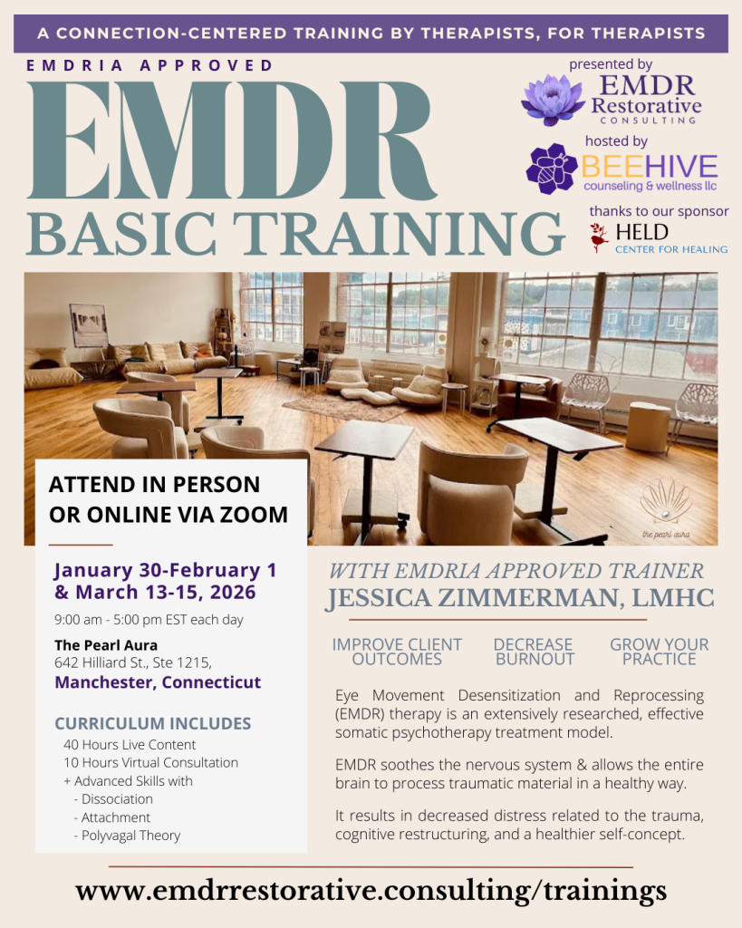 Join us for EMDRIA approved EMDR basic training either in person or online for 2 weekends. This training will help improve client outcomes, decrease burnout and grow your practice! The curriculum will include 40 hours of live content and 10 hours of virtual consultation. This is a connection-centered training done by therapists for therapists on EMDR.